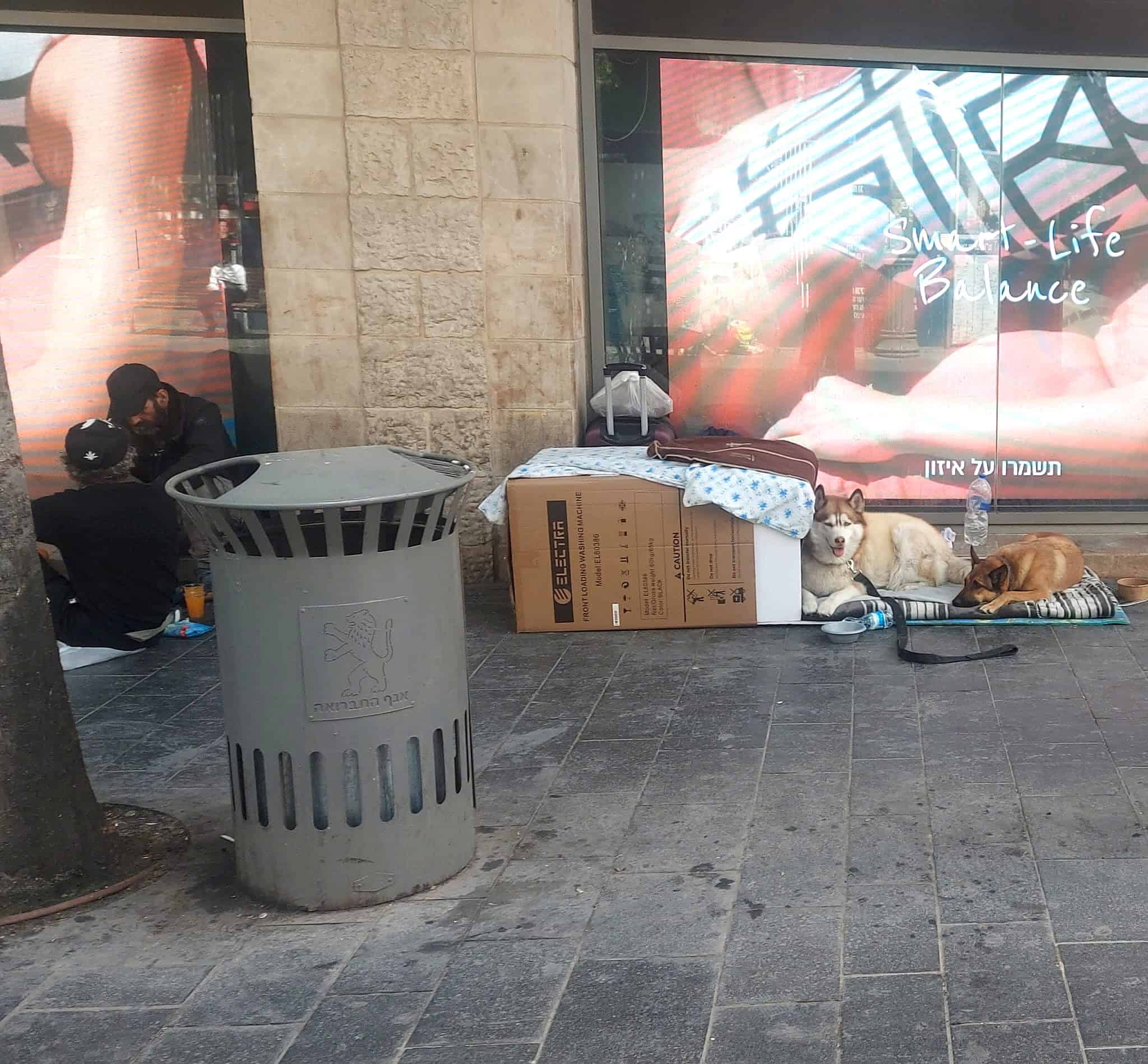ולמרגלות החנויות שמוכרות מוצרי יוקרה, יושבים מחוסרי הבית. חלקם מלווים בכלבים שהם לעיתים משפחתם היחידה. אין חגיגות עבורם. רק שגרת הישרדות יומיומית.