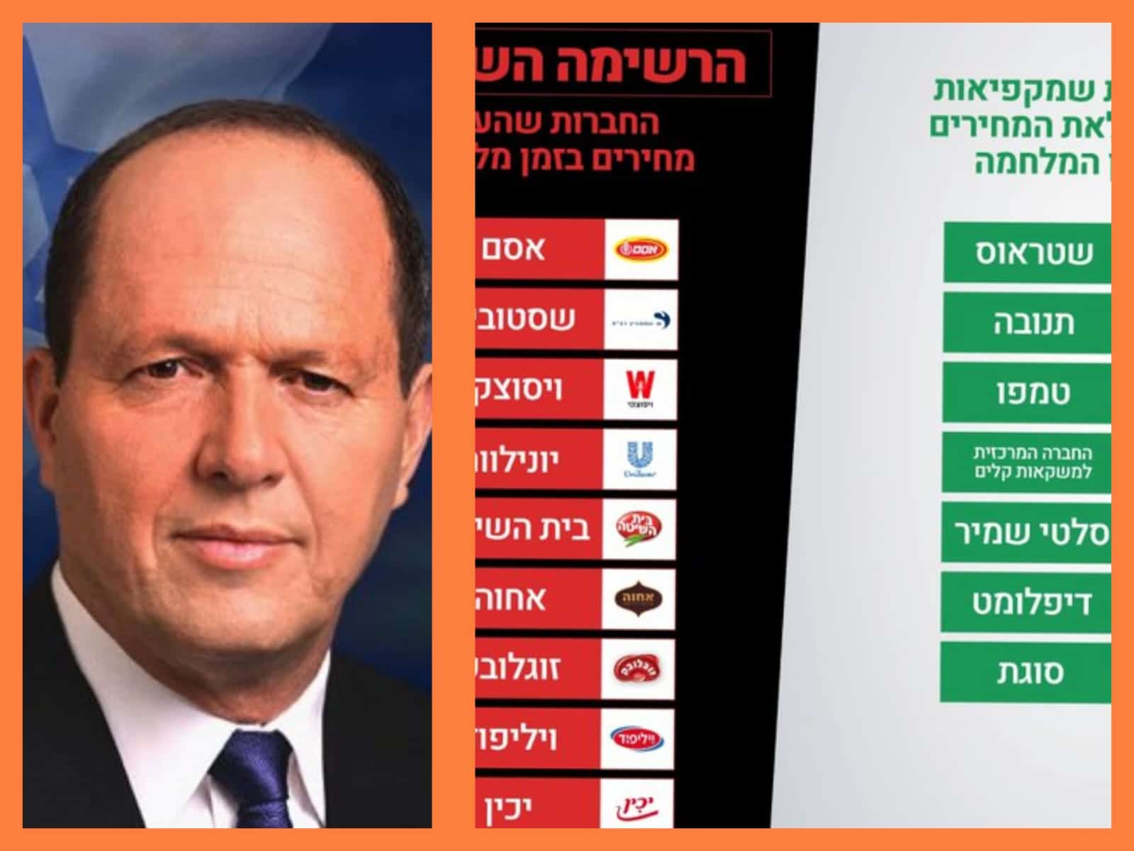 בפוסט שפרסם בחשבון ה-x שלו, נכללו ברשימה הירוקה שטראוס, תנובה, טמפו, החברה המרכזית למשקאות קלים, סלטי שמיר, דיפלומט וסוגת. כזכור, ברשימה השחורה שחשף מוקדם יותר ברקת, של חברות שלא הביעו את הסכמתן להוריד מחירים, נמצאות בין השאר אוסם, שסטוביץ', ויסוצקי, יונילוור, בית השיטה, אחוה, זוגולובק, ויליפוד ויכין.