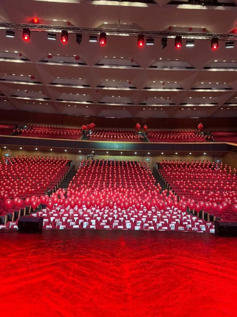 האולם הגדול בבנייני האומה התמלא בכ-3,000 בלונים לצד תמונות של החטופים והחטופות המוחזקים עדיין בשבי בעזה.
