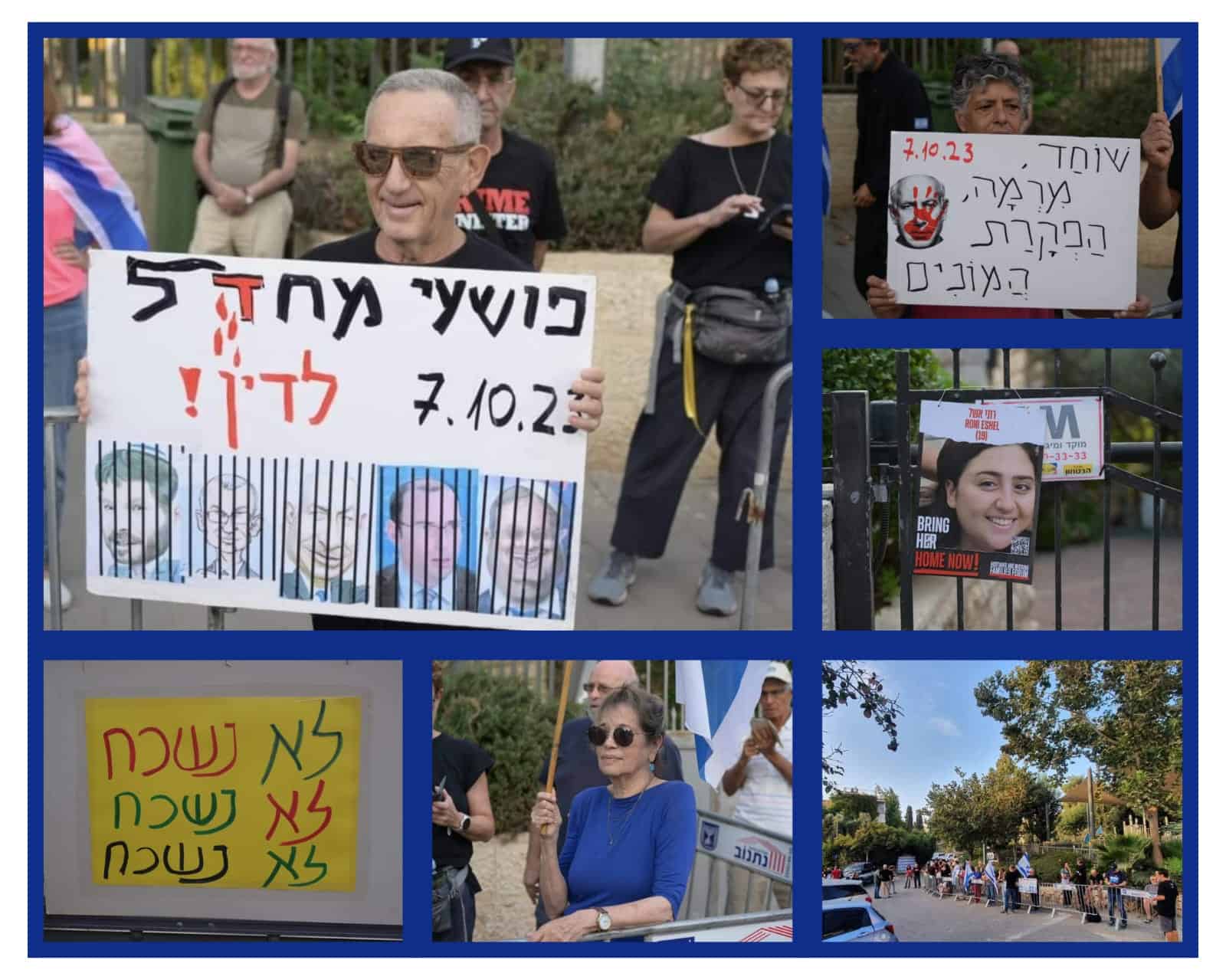 רחוב מרדכי כספי בשכונת ארנונה בירושלים במוקד: לאורך השבת, 28.10.23, שלושה שבועות לאחר מתקפתו הרצחנית של חמאס בדרום, מתקיימת משעות הבוקר מחאה נגד ראש הממשלה בישראל בנימין נתניהו.