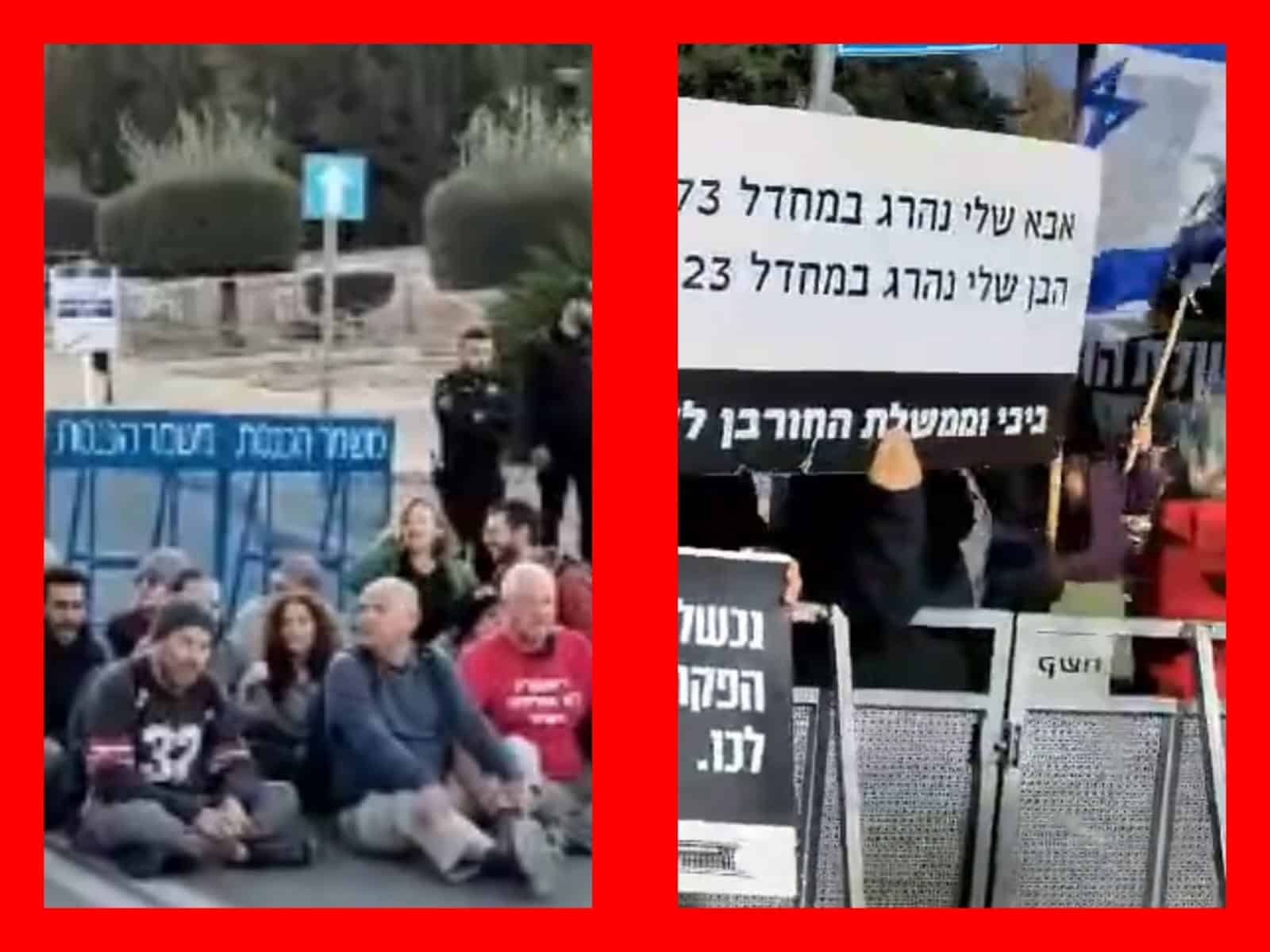 ההפגנה היום, שני, היתה סוערת במיוחד. המפגינים לא הסתפקו הפעם בקריאות ובהנפת שלטים בגנות המחדל של ה-7 באוקטובר וכמו כן לקיום בחירות עכשיו ולשחרור החטופים, אלא חסמו גם את כביש הגישה לכניסה הראשית להכנסת. המפגינים התיישבו על הכביש ומנעו בגופם כל אפשרות להגעת כלי רכב למשכן.