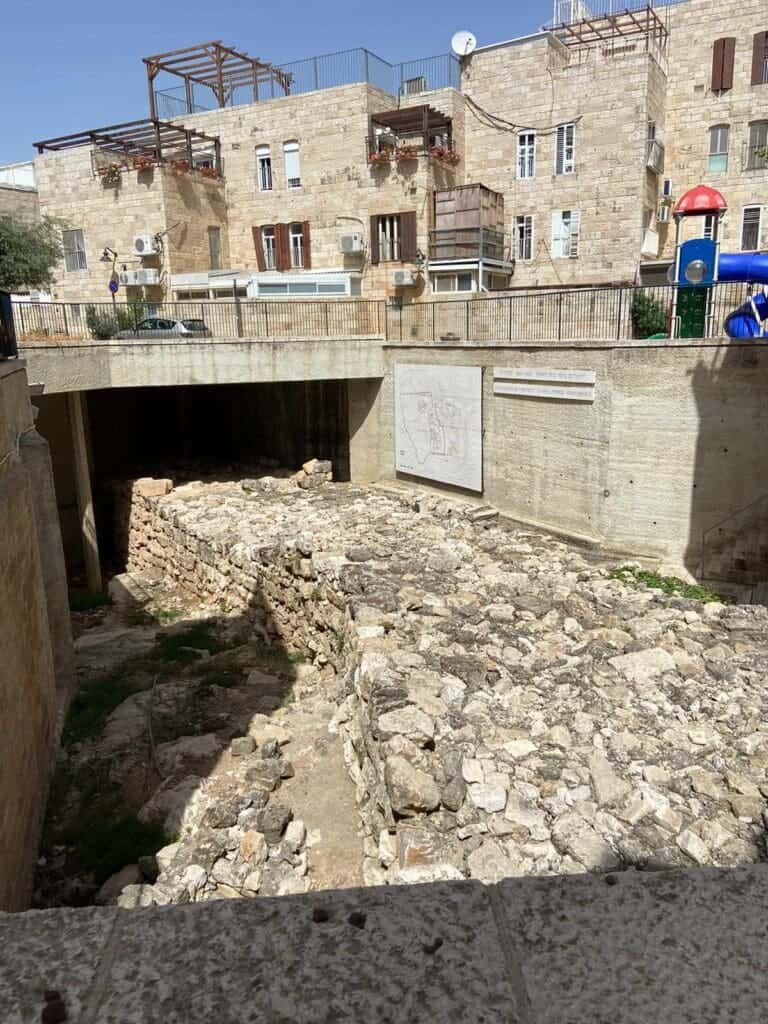 בואו נציץ דרך הפיר שקבוע ברצפה שהוא, למעשה, חלון בזמן. מזהים בעומק שרידי מבנים? זהו קטע מחומת חזקיהו, שאותה חשפה המשלחת הארכיאולוגית בראשותו של פרופ' נחמן אביגד לאחר מלחמת ששת הימים. הגילוי היה מרעיש והוכיח שירושלים היתה עיר גדולה שהלכה והתפשטה הנה, אל הגבעה המערבית, כבר בתקופת המקרא.