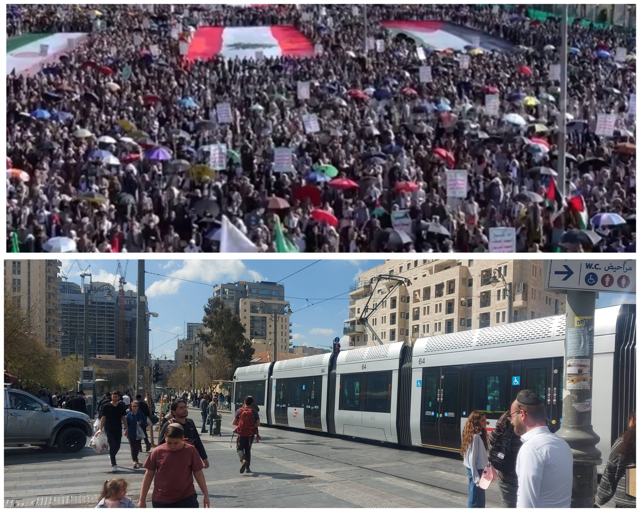 קולאז של מחאה המונית בצנעא שבתימן לצד הרכבת הקלה והולכי רגל במרכז ירושלים