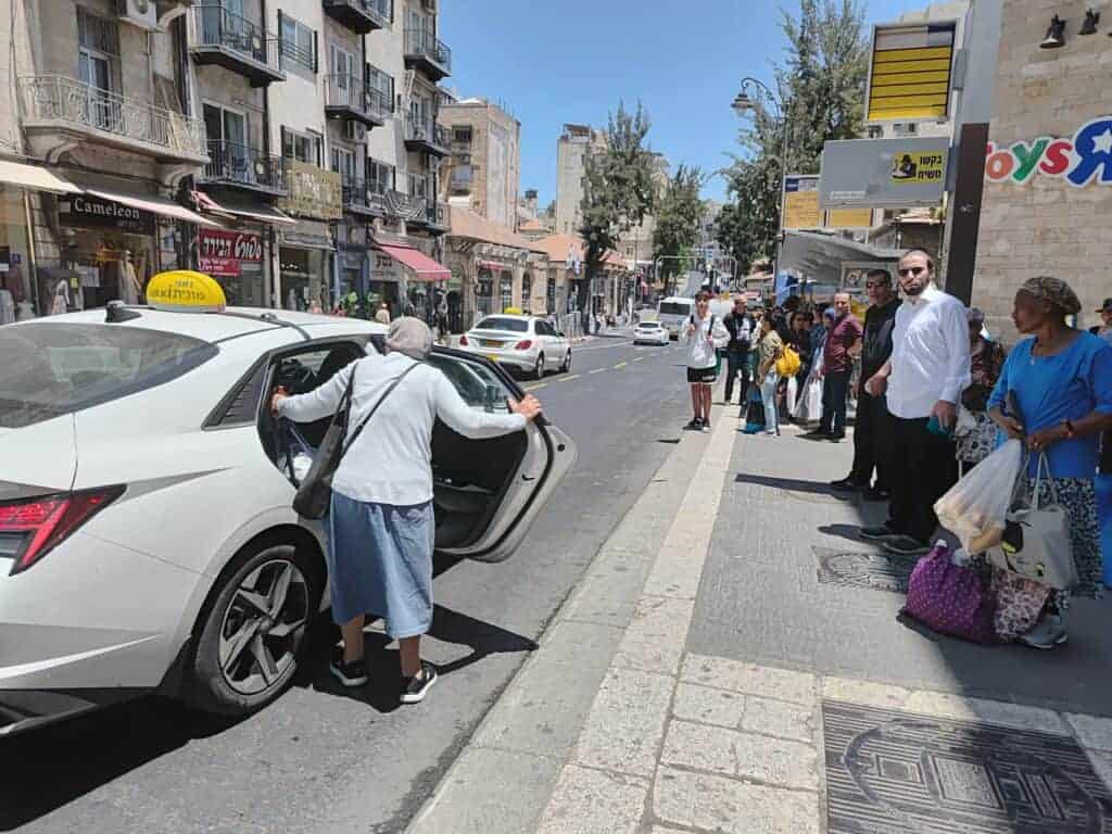 רחוב קינג ג'ורג' בירושלים יודע ימים עמוסים, אבל נדמה שכמה רגעים השבוע חידדו את קצב העיר. מונית לבנה עוצרת בדיוק מול תחנת האוטובוס, אישה מנסה להיכנס אליה באיטיות. מאחוריה – שיירה של נוסעים, חלקם בוהים מהסיטואציה, אחרים פשוט מותשים מהחום ומההמתנה. גם אם רק לרגע, העיר כמו עצרה את הנשימה.
