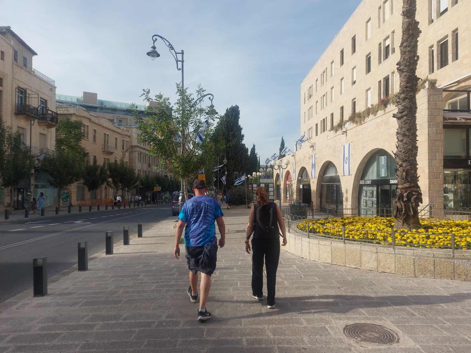 בתמונה שצולמה ברחוב המלך דוד, במרכז העיר, נראים שני מטיילים צועדים בנחת. מאחוריהם קו של דגלי ישראל שעדיין לא הוסרו מאז אירועי יום העצמאות. סביבם – מרבדי פרחים צהובים ששתלה העירייה מול הכניסה למתחם ממילא, מעגל שקט של צבע בתוך הקיר האבן הירושלמי הקבוע.