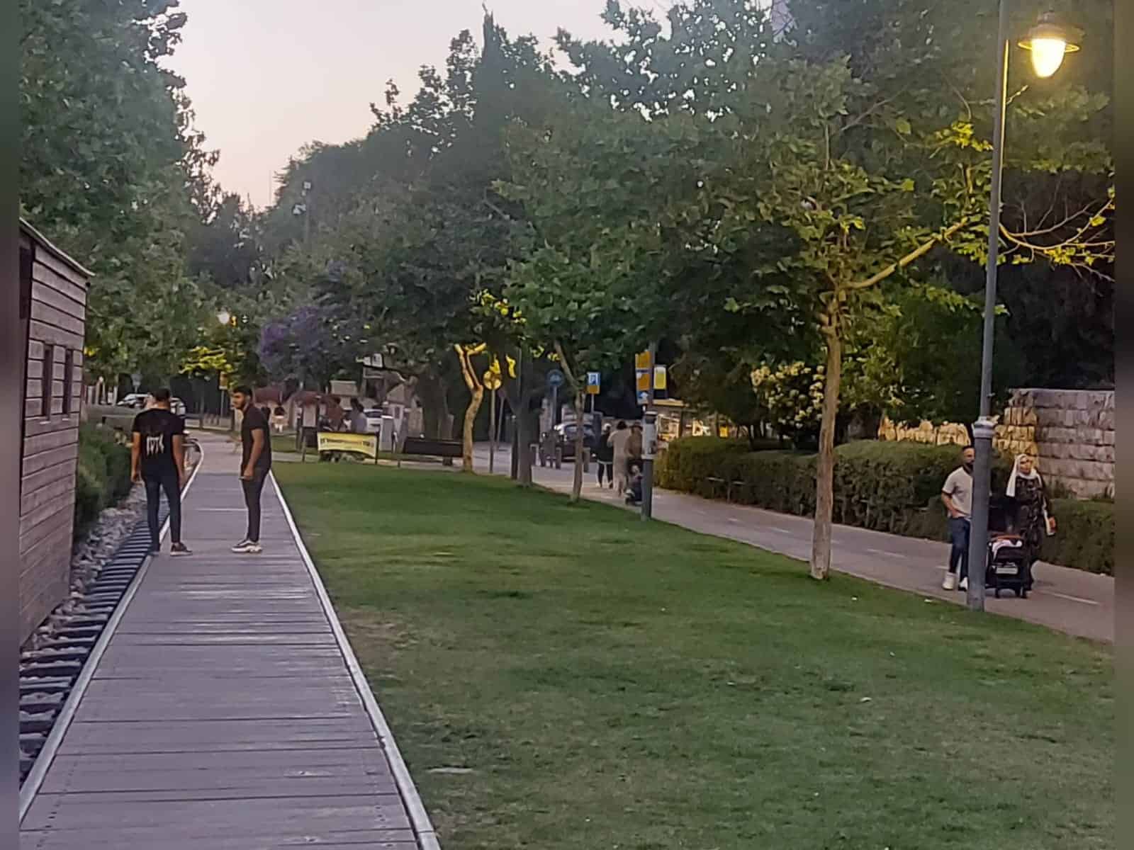 People walking quietly in Jerusalem's Mesila Park at dusk