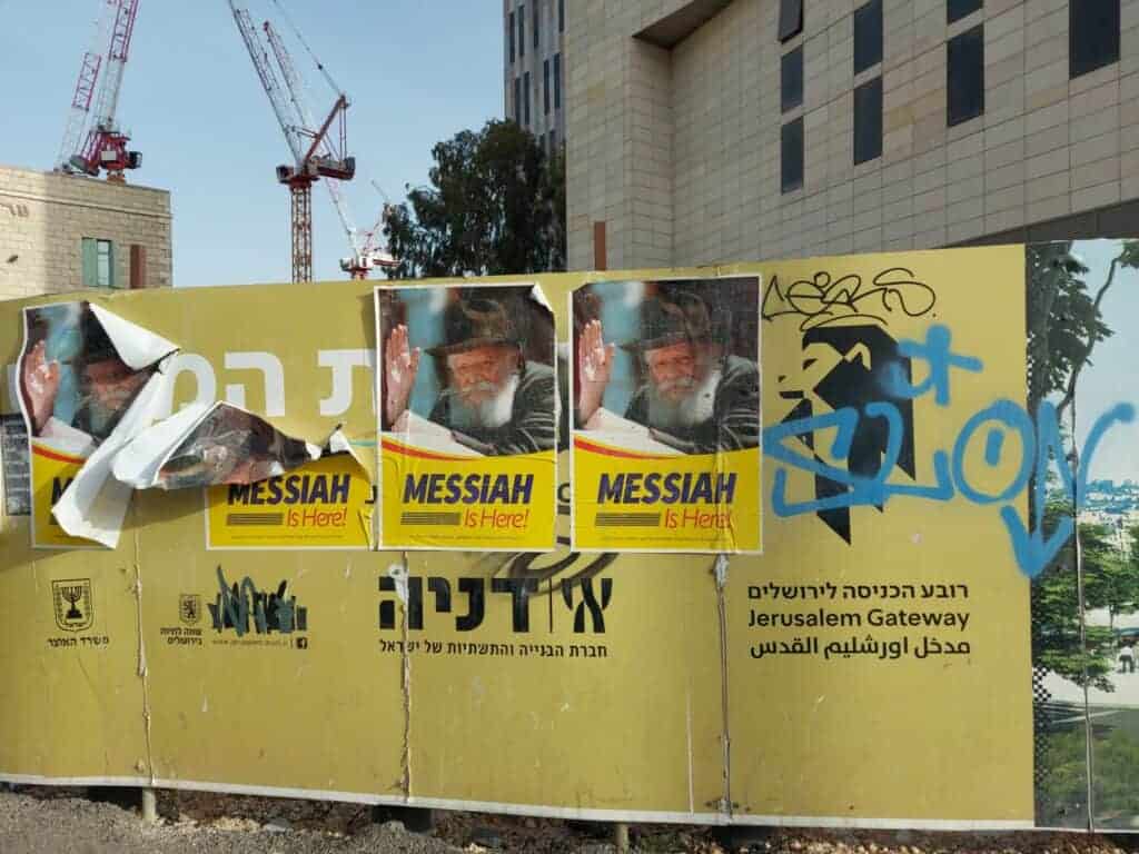 פוסטר של הרבי מליובאוויטש עם כיתוב "Messiah is here" מודבק על קיר בטון באזור הכניסה לירושלים