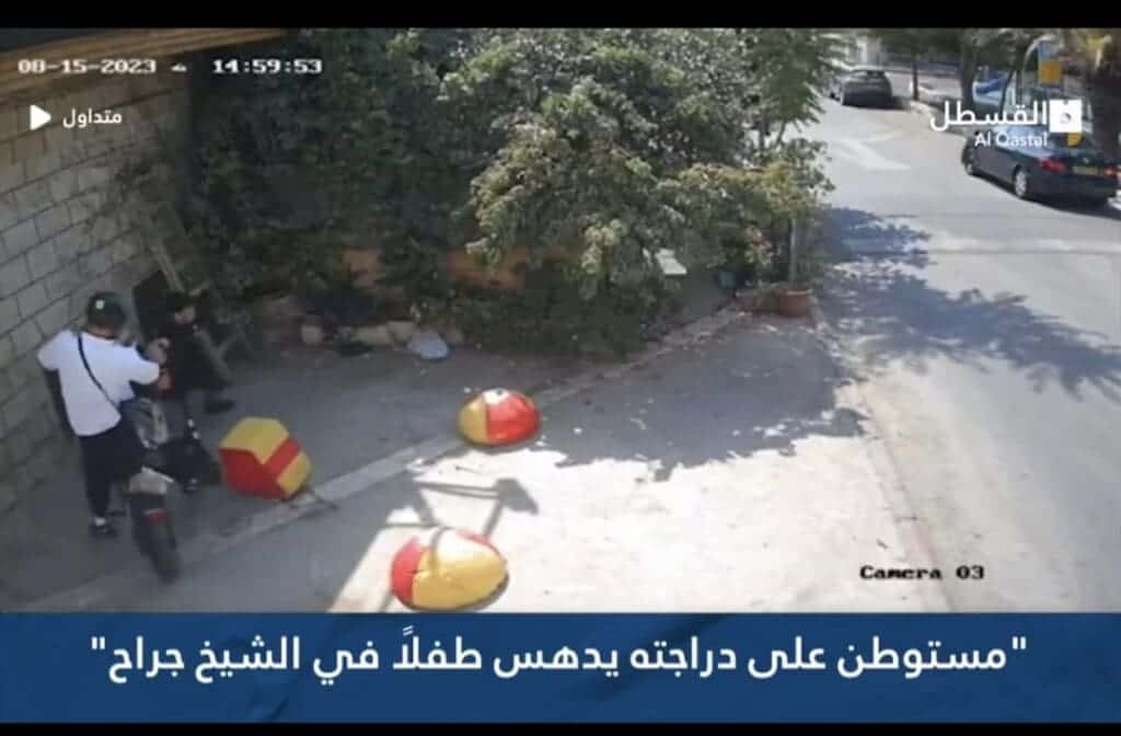 הפלסטינים מעלים לרשת סרטון ממצלמת אבטחה שצולם ב-15.8.2023 בשעה 15:00 בשכונת שיח' ג'ראח. בסרטון נראה, לכאורה, ניסיון דריסה של ילד פלסטיני ע"י יהודי.