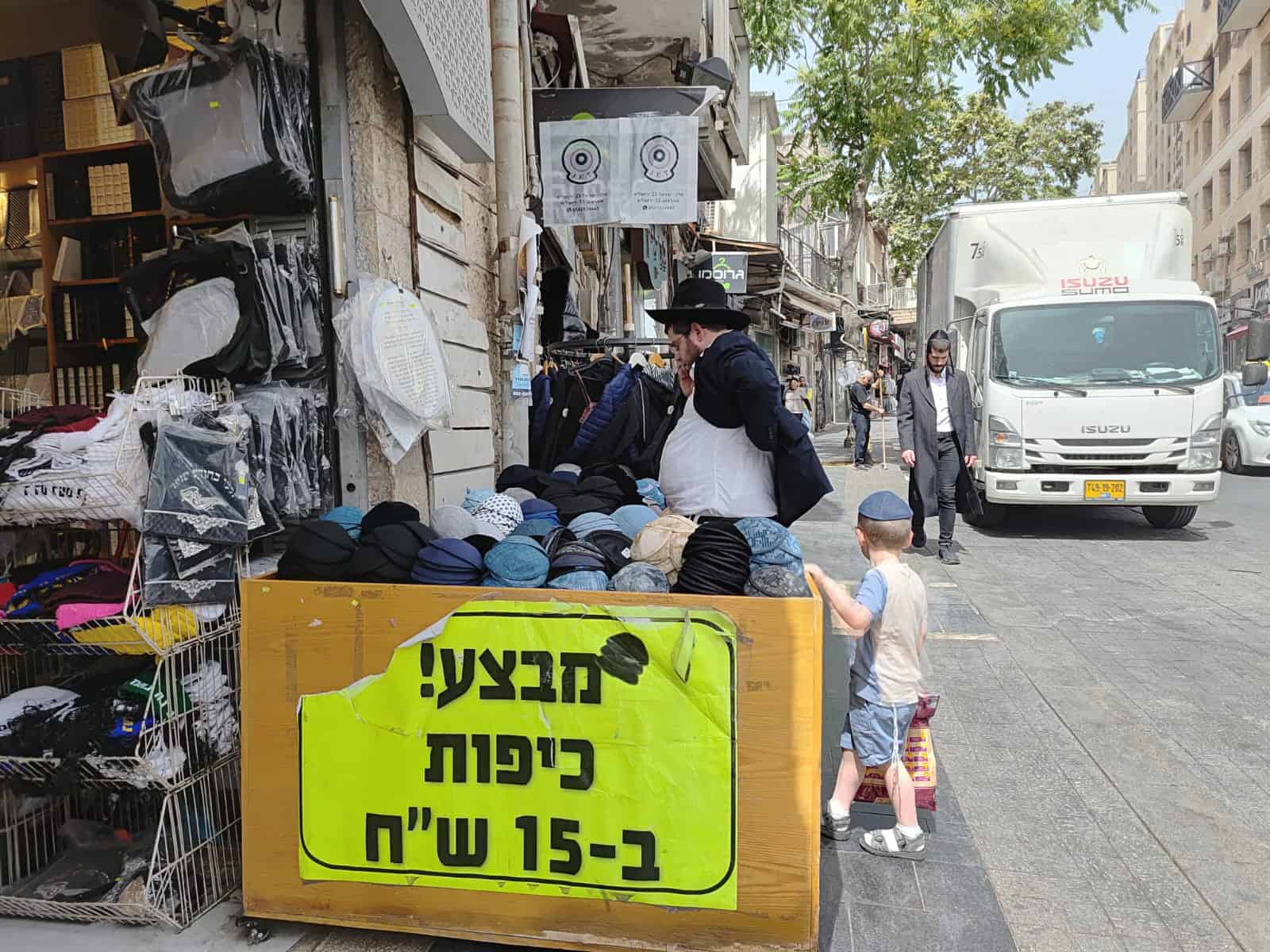 רחוב מלכי ישראל בגאולה נראה השבוע כמו שוק מועד לקרנבל צרכני – אבל כזה שלא מתנצל בשקט. דוכנים מאולתרים, שלטים צהובים זועקים "מבצע!", וכיפות מכל סוג וצבע נערמות בקופסה אחת. המחיר? 15 שקלים בלבד – לכל כיפה, בלי שאלות, בלי מיקוח. ילד קטן סוקר את ההיצע ברצינות של קניין מקצועי, גבר חרדי בודק את עובי הבד בידיים מיומנות, והמשאית הלבנה שעוברת מאחור רק מדגישה את המתח בין מסורת לצרכנות.