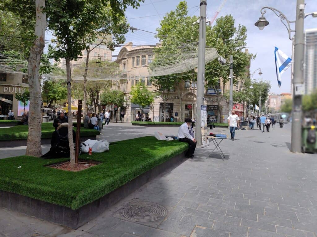 שבת בבוקר בירושלים. הכבישים דוממים, הקצב אחר, ורק הכיכרות עוד פועמות מתחת לפני השטח. בכיכר ציון, אין הפגנה, אין במה פתוחה, אין אפילו שוטר. אבל הספסלים הירוקים – עשויים דשא סינתטי – לא ריקים.