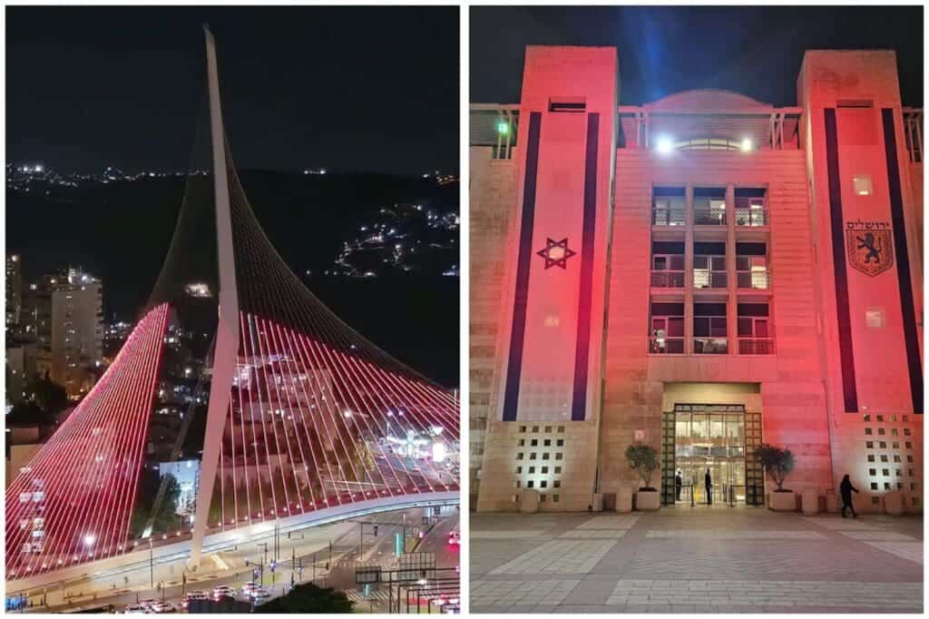 נורות אדומות: בניין העירייה בכיכר ספרא בירושלים וגשר המיתרים בכניסה לעיר הוארו אתמול בערב, יום שני, באדום – לציון היום הבינלאומי למאבק באלימות כלפי נשים.