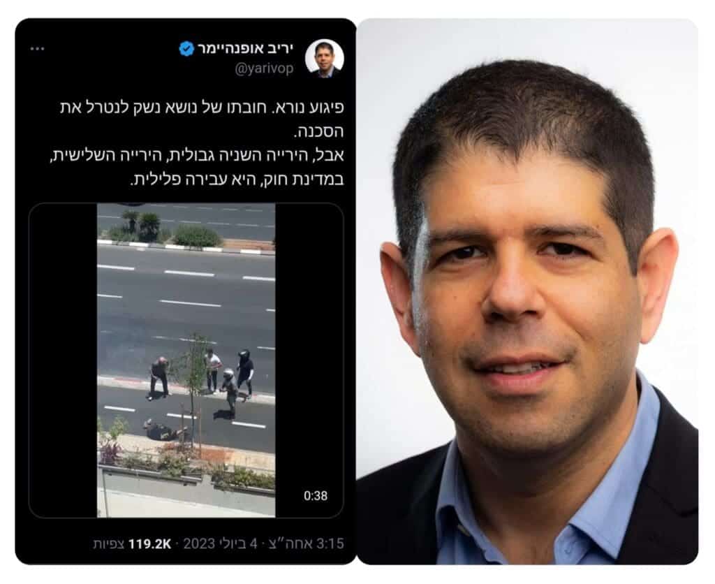 יריב אופנהיימר, חבר הנהלת שלום עכשיו, הרגיש כנראה שהציוץ הזה נחוץ, ממש זמן מה לאחר הפיגוע בנאות אפקה: "פיגוע נורא", כתב אופנהיימר בציוץ שזכה לתגובות רבות, "חובתו של נושא נשק לנטרל את הסכנה.