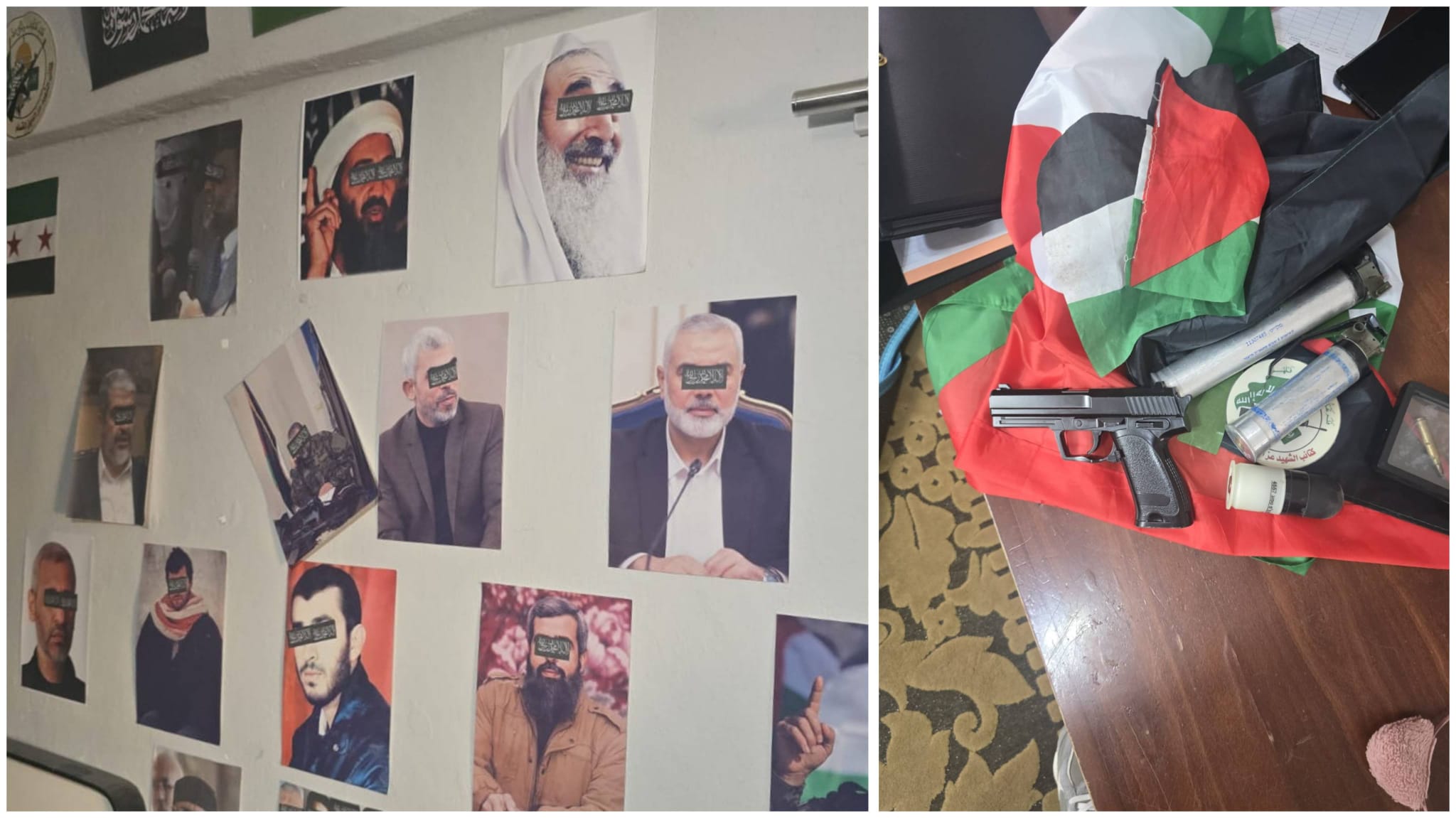 כך בדיוק נראה המקרה שנחשף השבוע בדירה בשכונת בית חנינא שבמזרח ירושלים. בתוך חדר קטן נתגלו קירות מכוסים בתמונות של דמויות המזוהות עם ארגונים חמושים, לצד דגלים וסמלים שונים. על שולחן סמוך נמצאו גם פריטים נוספים: אקדח איירסופט, תרמילים ריקים של רימוני גז ואביזרים נוספים.