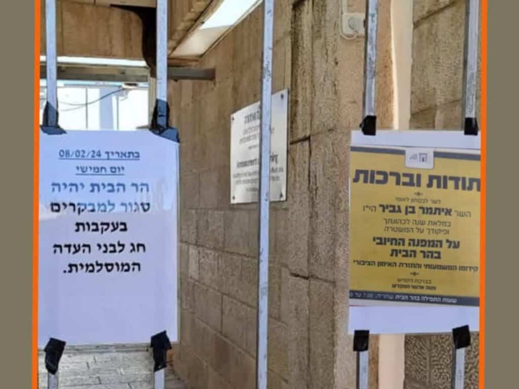 ארנון סגל, אחד הפעילים המרכזיים של הר הבית, מצייץ, "פתוח לתומכי חמאס בלבד", ומצרף תמונה של המודעה שנתלתה על השער.