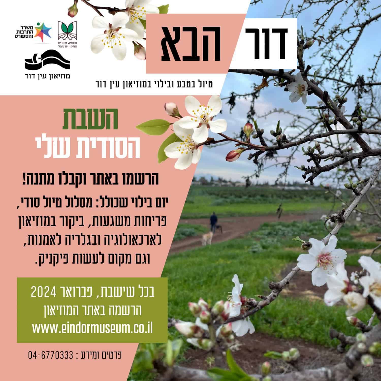מוזיאון עין דור – הכולל מוזיאון לארכיאולוגיה וגלריה לאמנות עכשווית, מציג תכנית חדשה ומפתיעה לחודש פברואר, הכוללת בין השאר בילוי שישי-שבת הכולל מסלולי טיול, פריחות משגעות, המלצות לפיקניקים, ולקינוח ביקור בחינם בתערוכות המוזיאון.