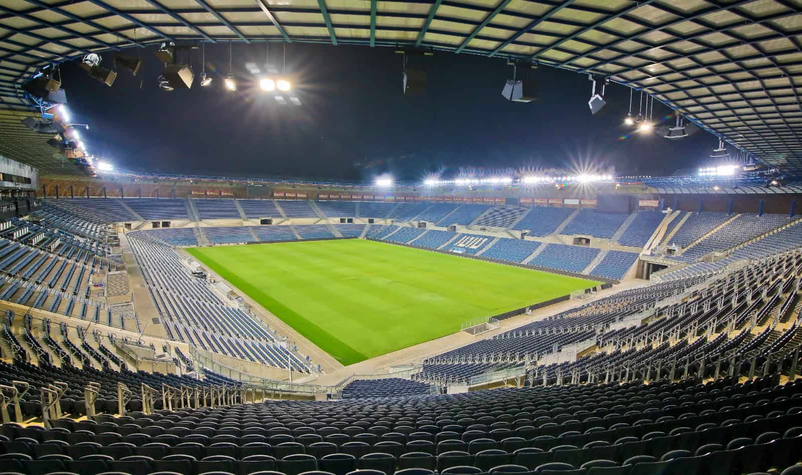 מבט רחב על אצטדיון טדי בירושלים בשעות הלילה, יציעים ריקים ותאורה עוצמתית – ההיערכות לאירוע הספורט המרכזי של השבוע