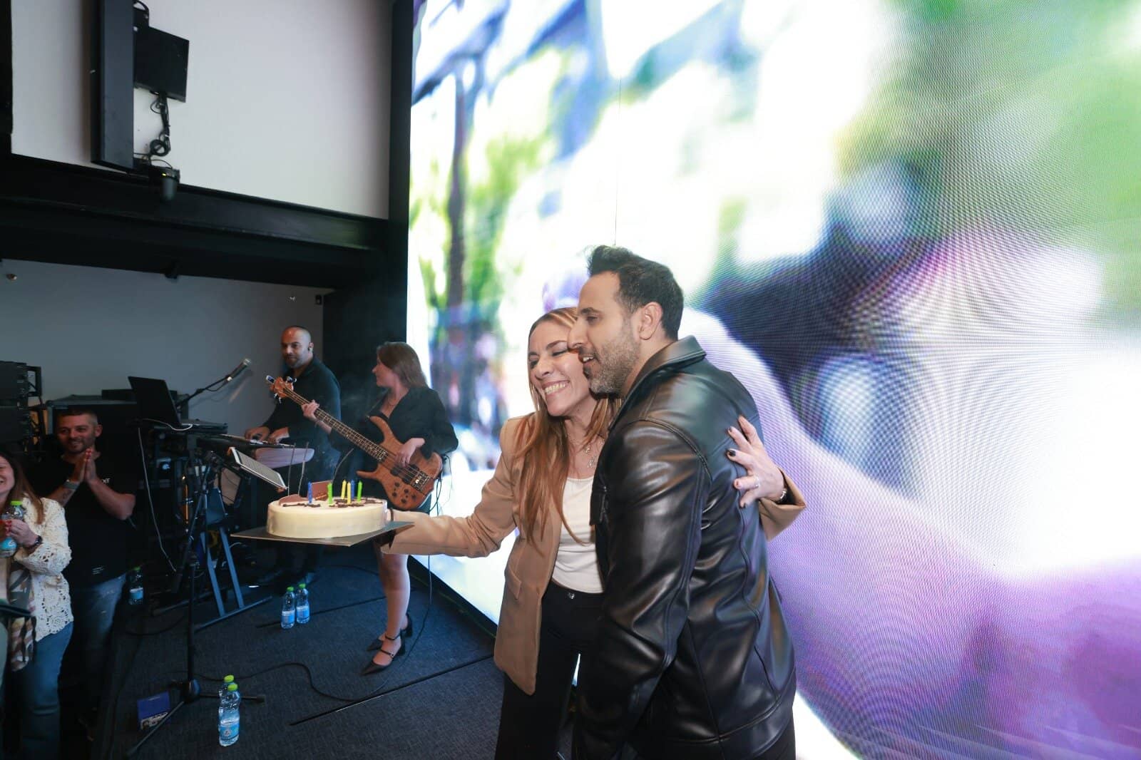 יש לנו כאן בתמונות את מנהלת האירועים במוזיאון ידידי ישראל מעניקה עוגת יומולדת לדודו אהרון. מזל טוב.