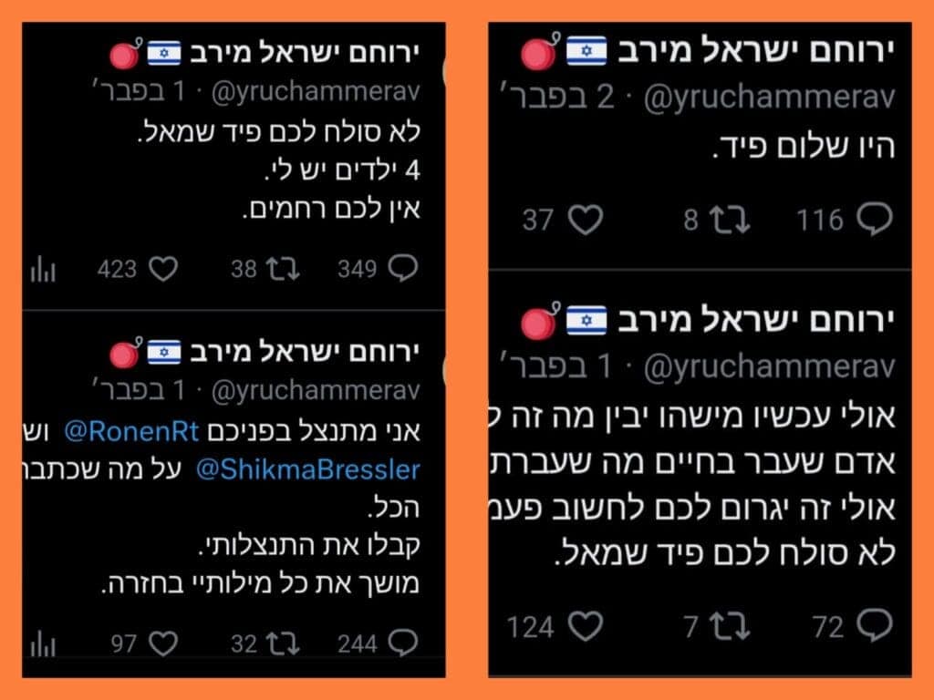 עוד כותב ירוחם ישראל מירב כי "לא סולח לכם פיד שמאל. 4 ילדים יש לי. אין לכם רחמים. הצלחתם לפרק את נשמתי. תודה לכם. אני סובל מפוסט טראומה מאז אסון מירון. מתו לי בידיים המון אנשים. אנשים רעים, בגללכם. אלוהים ינקום בכם אחד אחד. היו שלום".