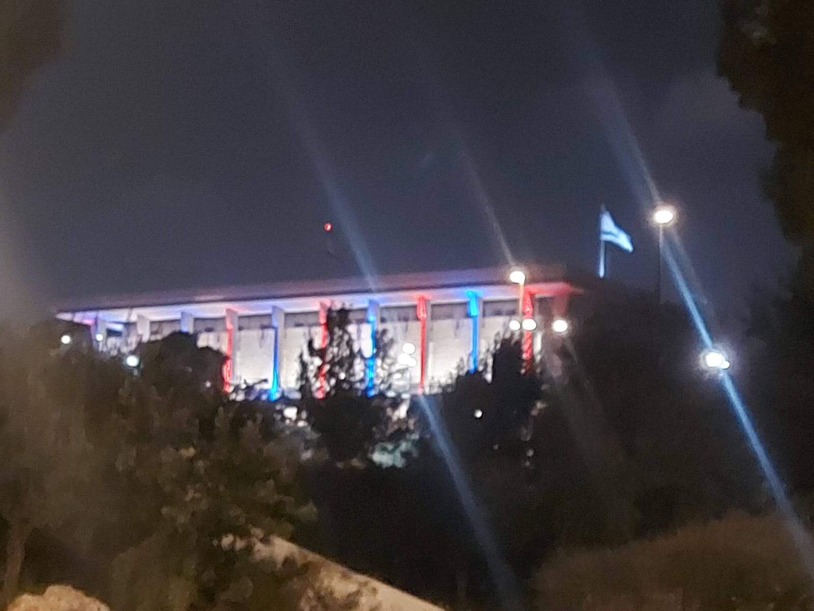 ובזה הלילה בדיוק, בניין הכנסת בירושלים הואר בתאורה יוצאת דופן: כחול, לבן – וגם אדום.