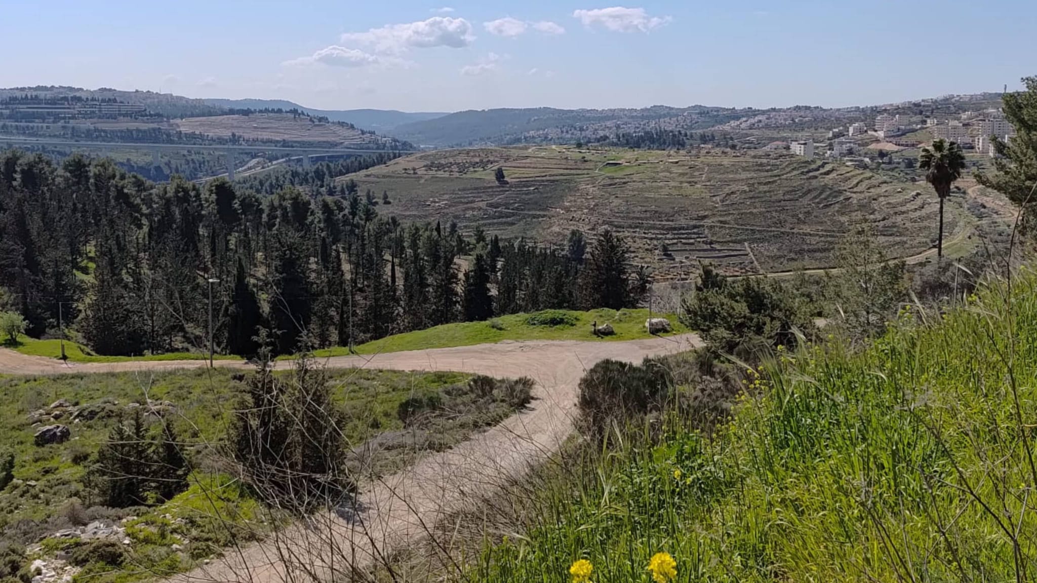 צהריים של אור ביער רמות בירושלים. יער ממנו אפשר לתצפת אל קו אופק אחד המוביל לעיר השכנה בית שמש, שהוכתה בטיל איראני בפגיעה ישירה. קו ראייה אחד המחבר בין צמיחה, ירוק וחמציצים אל חורבן, הרס ומוות.