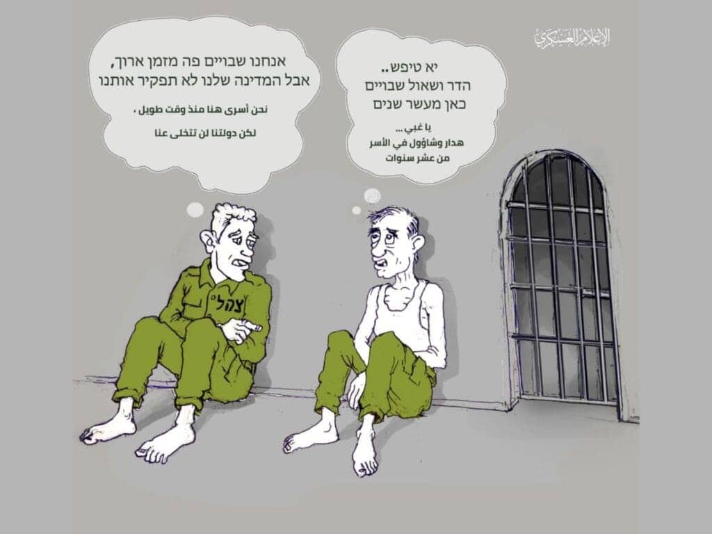 השבוע מפרסם חמאס בפלטפורמות הדיגיטליות שמזוהות עמו קריקטורה – מכאיבה מאוד בעיניים ישראליות. בקריקטורה מביעה דמותו של חטוף אופטימיות כי מדינת ישראל ודאי דואגת לו ותחזיר אותו לביתו, אך מנגד, רעהו, חטוף נוסף, מסביר לו כי שנים רבות שבהן מוחזקים בעזה סמ"ר אורון שאול ז"ל וסגן הדר גולדין ז"ל – וממשלת ישראל לא משיבה אותם.