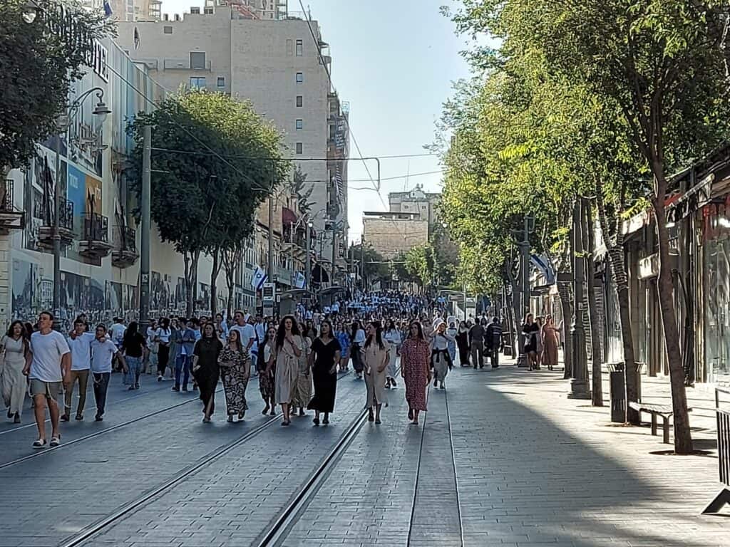 הרחוב הראשי בירושלים, בפתחו של שבוע שבו חלים יום ירושלים 2025 ערב חג שבועות, לא נראה כמו עוד סצנה עונתית. ברחוב יפו נפרשה שיירה אנושית וסוחפת: אלפי צעירות וצעירים, רובם מקרב הציבור הדתי־לאומי, פוסעים יחד בצניעות, בסדר מופתי, כשדגלי ישראל בידיהם ושירה בפיהם. אך עבור מי שהולך שם, זו לא תהלוכה – זו שגרה.