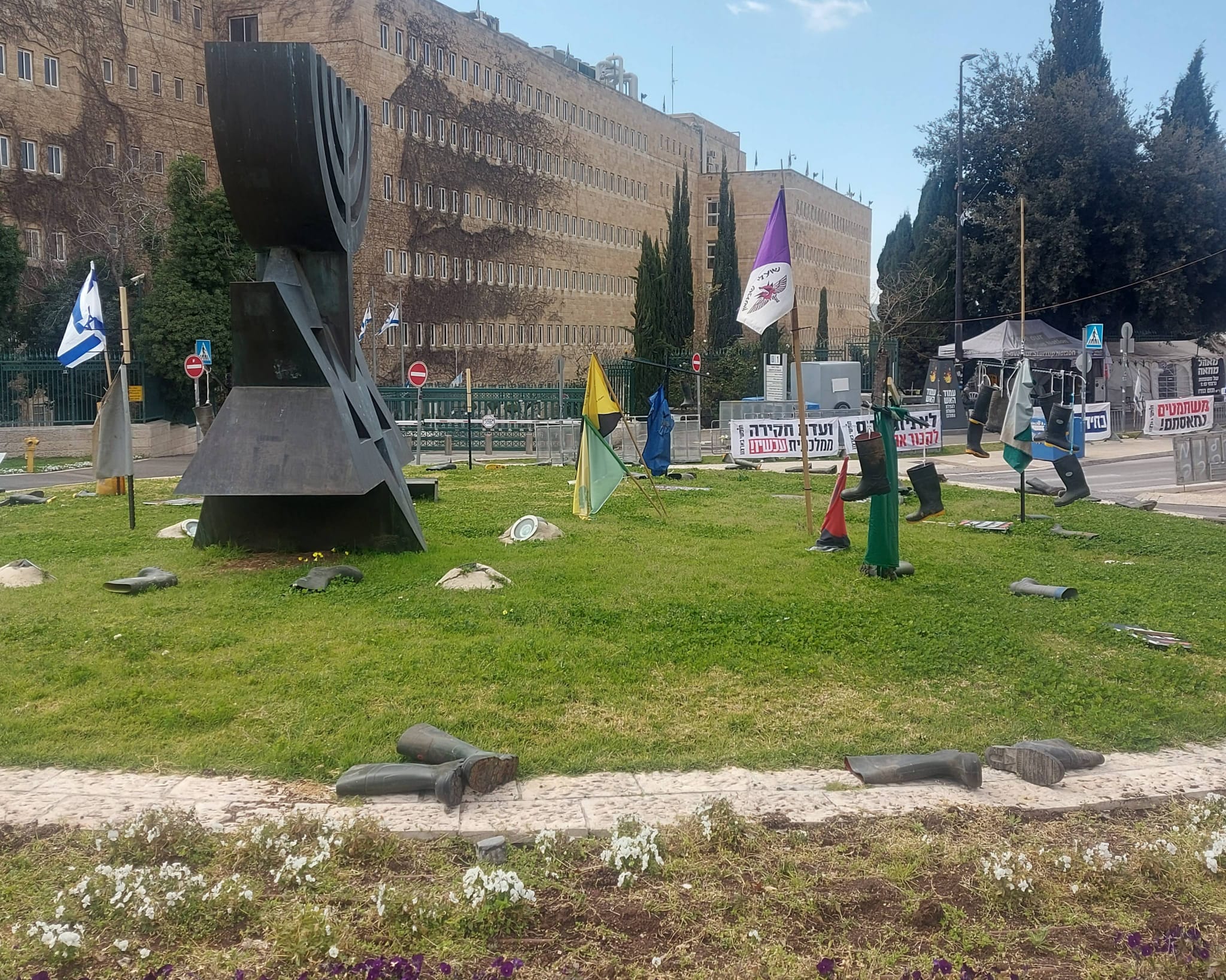 מול בניין הכנסת בירושלים ניצב בימים האחרונים מיצג מחאה יוצא דופן: עשרות מגפי עבודה של רפתנים פזורים על הדשא בכיכר הסמוכה לפרלמנט. חלקם תלויים על מוטות לצד דגלים ושלטים, אחרים מונחים סביב הפסל שבמרכז הכיכר. אבל מי שמגיע למקום מגלה משהו חריג: כמעט אין מפגינים.