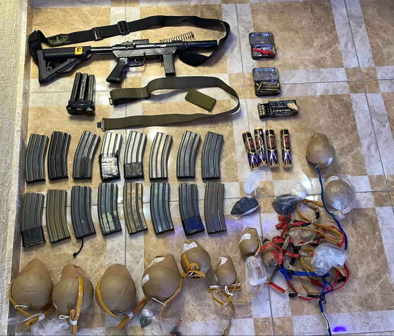 במהלך החיפוש בבית איתרו השוטרים: נשק מסוג קרלו, 19 מחסניות, רימוני זיקוקין, 2 שקיות אבקת שריפה ותחמושת לנשק מסוג 9 מ״מ ו-5.56.