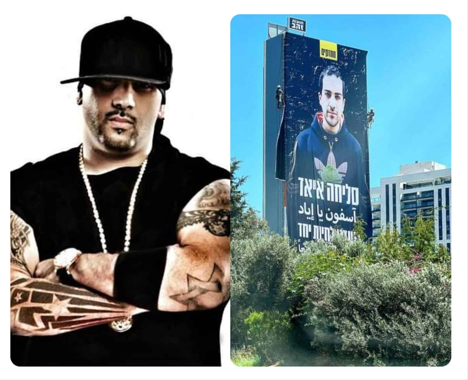 על שלט הענק מופיעה תמונתו של אל חלאק, ותחתיה הכיתוב, "סליחה איאד".