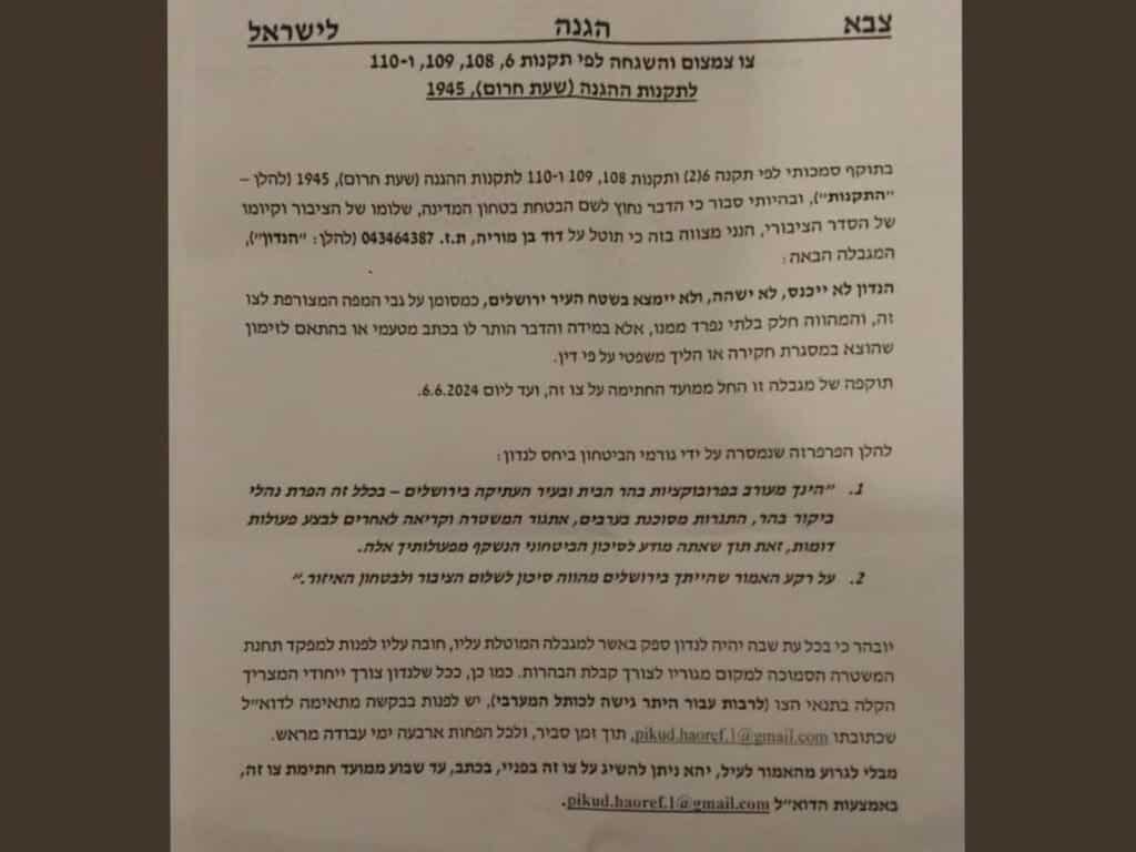 בצו מתוארת הסיבה להוצאתו – "הנך מעורב בפרובוקציות בהר הבית ובעיר העתיקה בירושלים – בכלל זה הפרת נהלי ביקור בהר, התגרות מסוכנת בערבים, אתגור המשטרה וקריאה לאחרים לבצע פעולות דומות".