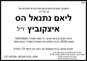 הלווייתו של ליאם איצקוביץ ז"ל, תתקיים ביום חמישי בערב בירושלים בגבעת שאול. המשפחה תשב שבעה בבית משפחת הם – סבו וסבתו מצד אביו, ברחוב קרן היסוד בירושלים.