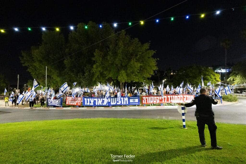 מולם, התאספו כמה עשרות פעילים התומכים במהפכה המשפטית, ואולי אף מאמינים באג'נדות מרחיקות לכת – חלק מהשלטים בצד הזה של המתרס הביעו תמיכה בכהניזם.