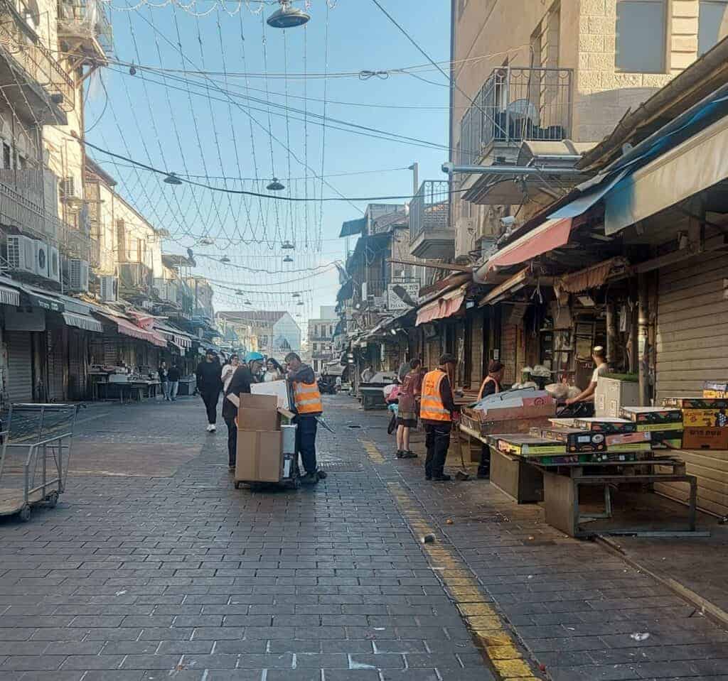 הנה תיעוד רגעים אחרונים לפני שהכול נסגר: הסוחרים מפנים את הדוכנים, פועלים באפודים זוהרים מסדרים את הקרטונים, שאריות של ירקות וארגזים מפוזרים, והאוויר מלא במה שכמעט ולא קיים באף שוק אחר בעולם – תדר ירושלמי של סיום.