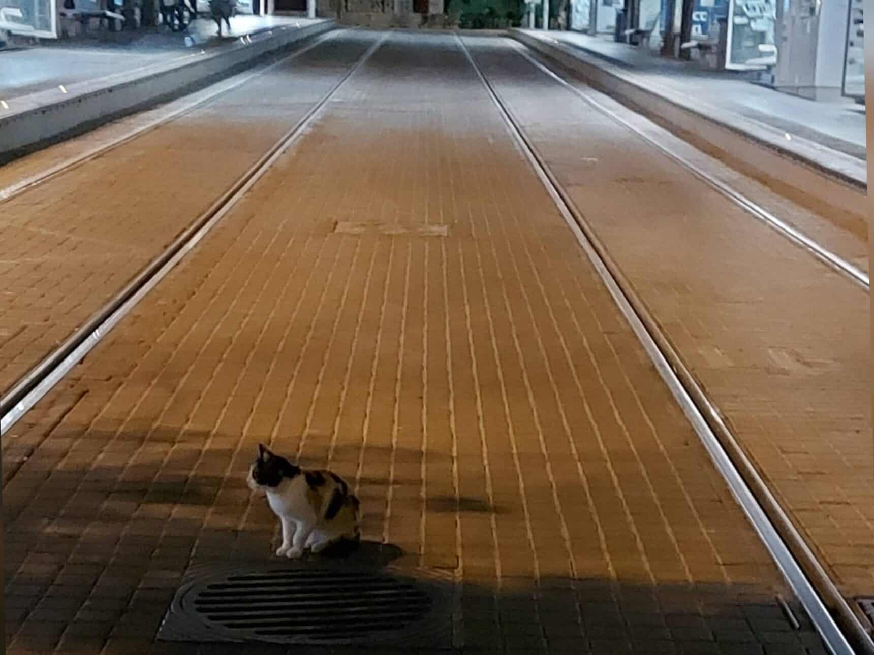 רק חתול נשאר ברחוב יפו. לא רכבת קלה, לא אדם – אפילו הצל של בית הקפה נסוג פנימה.