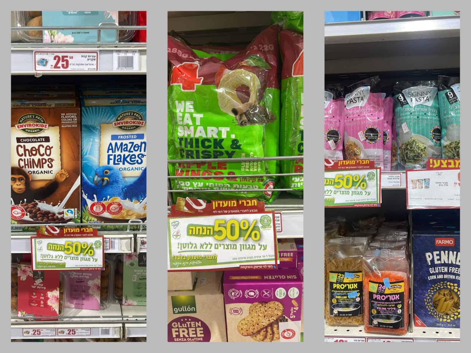 בין המוצרים שמחירם ירד משמעותית תודות למבצע, ניתן למצוא בורקס פיצה ללא גלוטן 500 גרם, שעלה לפני מבצע 19.70 ש"ח ואחריו עומד מחירו על 9.85 ש"ח בלבד; פתי בר קלאסי ללא גלוטן 200 גרם – מחיר לפני מבצע 5.90 ש"ח, ולאחריו 2.95 ₪; FREE פרי חטיף דגנים עם שוקולד ללא סוכר 100 גרם – מחיר לפני מבצע 14.80 ש"ח, ולאחריו 7.40 ש"ח; GFREE תערובת קמח תופח 500 גרם – מחיר לפני מבצע 19.70 ש"ח, ולאחריו 9.85 ש"ח, וכן מזרח ומערב מקלוני אורז ללא גלוטן 454 גרם – מחיר לפני מבצע 9.90 ש"ח, ולאחריו 4.95 ש"ח בלבד.