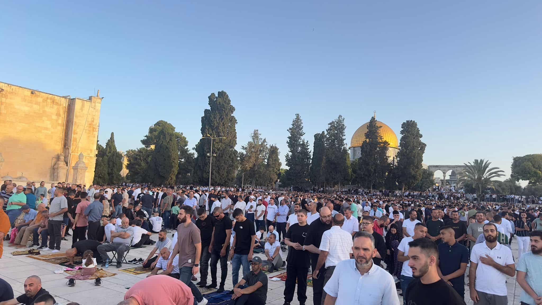 כ-40000 מוסלמים, בהם גם ערביי ישראל, עלו עם שחר ובמהלך היום לתפילת החג הראשונה במסגד אל אקצא. בשל ה"ג'ינוסייד", כהגדרת הפלסטינים, המתחולל בעזה, הורו אנשי הדת המוסלמים, ובראשם שיח' עכרמה סברי, ראש המועצה האסלאמית העליונה ולשעבר המופתי של ירושלים, להימנע מגלויי שמחה ולהסתפק רק בתפילות ובטקסים המחויבים עפ"י כללי השריעה. ואכן, מלבד ילדים בודדים שאחזו בידיהם בלונים, לא נצפו במשך היום סממני שמחה במתחם ההר.