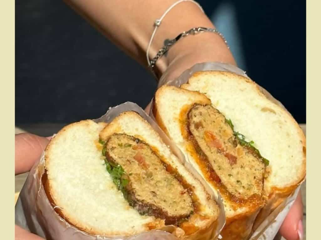 שניצל בחלה: שניצל קריספי דק, מטבוחה, איולי לימון כבוש, סטייק חציל וכוסברה 42 שקלים,