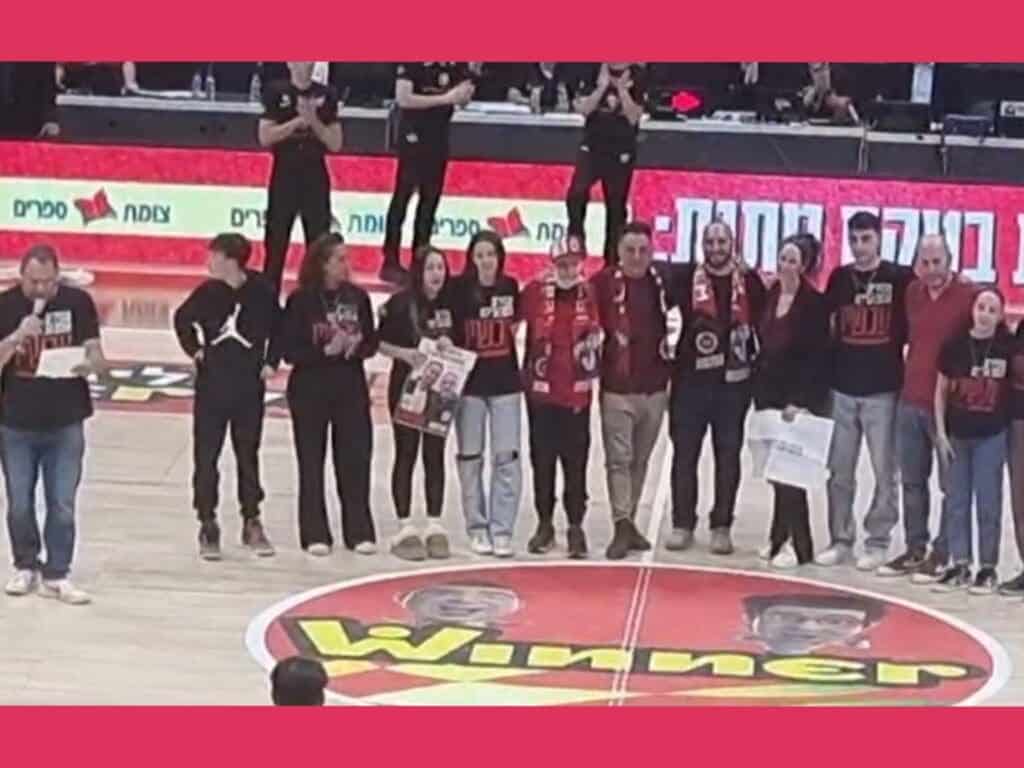 את הטקס המרגש, שבו עמדו על הפרקט בני משפחת אנגל ושרעבי, ליוו אלפי אוהדי הפועל ביציעים עם הקריאה – "להחזיר את כולם הביתה".