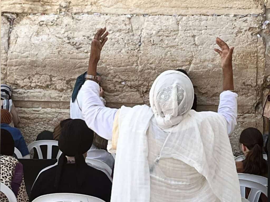 في قسم الرجال، لا تزال لفائف التوراة مزينة ومفتوحة في الساعات الأخيرة قبل بدء الحداد. من الجانب الآخر، ترفع النساء أذرعهن نحو السماء، وتخرج الدعوات من القلوب: للصحة، للزواج، للسلام، ولرفع البلاء. الحائط الغربي مكتظ بالأوراق، تشققات الحجارة ممتلئة، وبعض الأوراق تتساقط على الأرض.