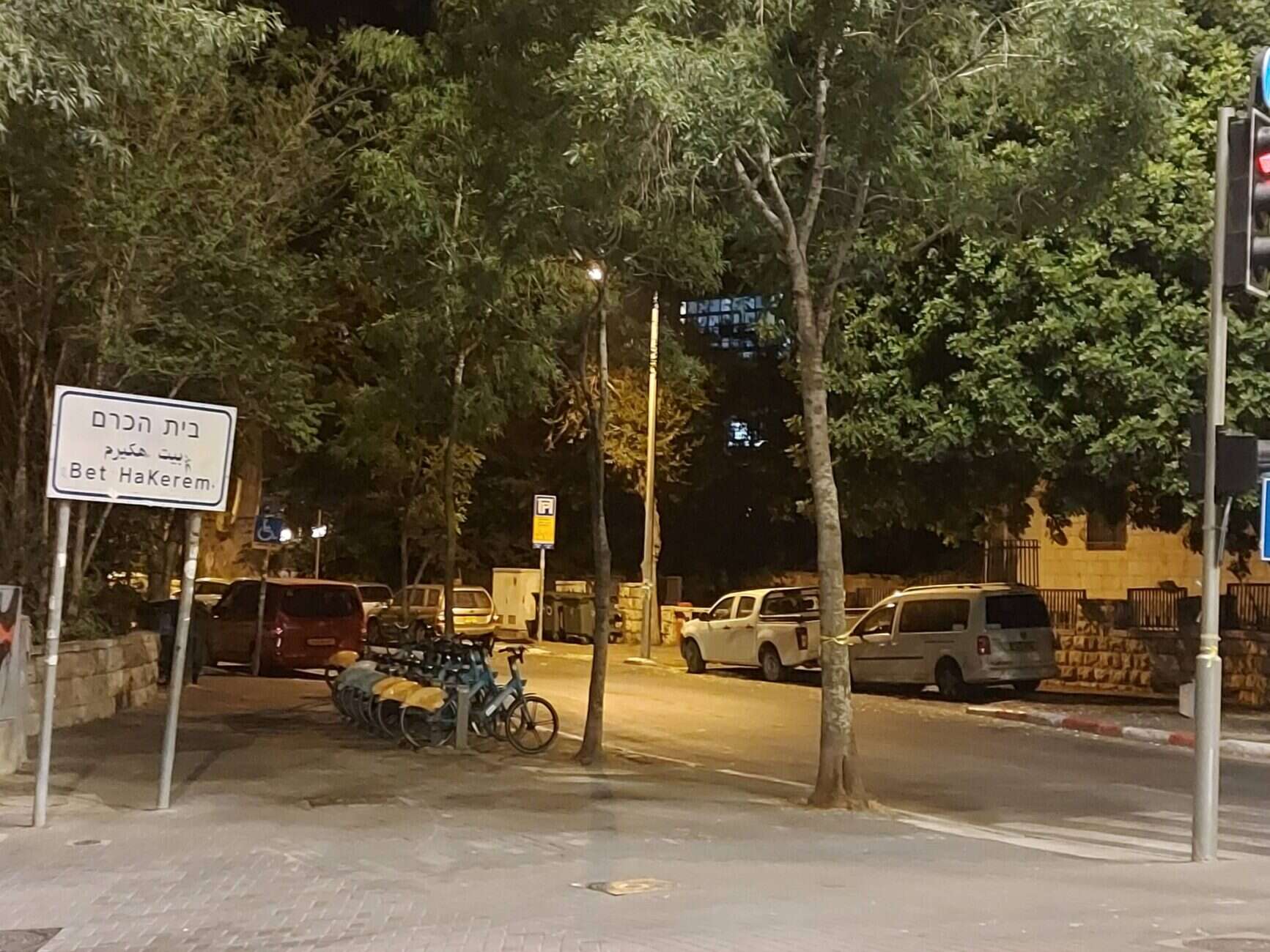 In the photo attached to this story, a simple sign reads “Bet HaKerem.” It stands quietly by a bike rental station, under a shaded tree, lit by the last of the afternoon sun