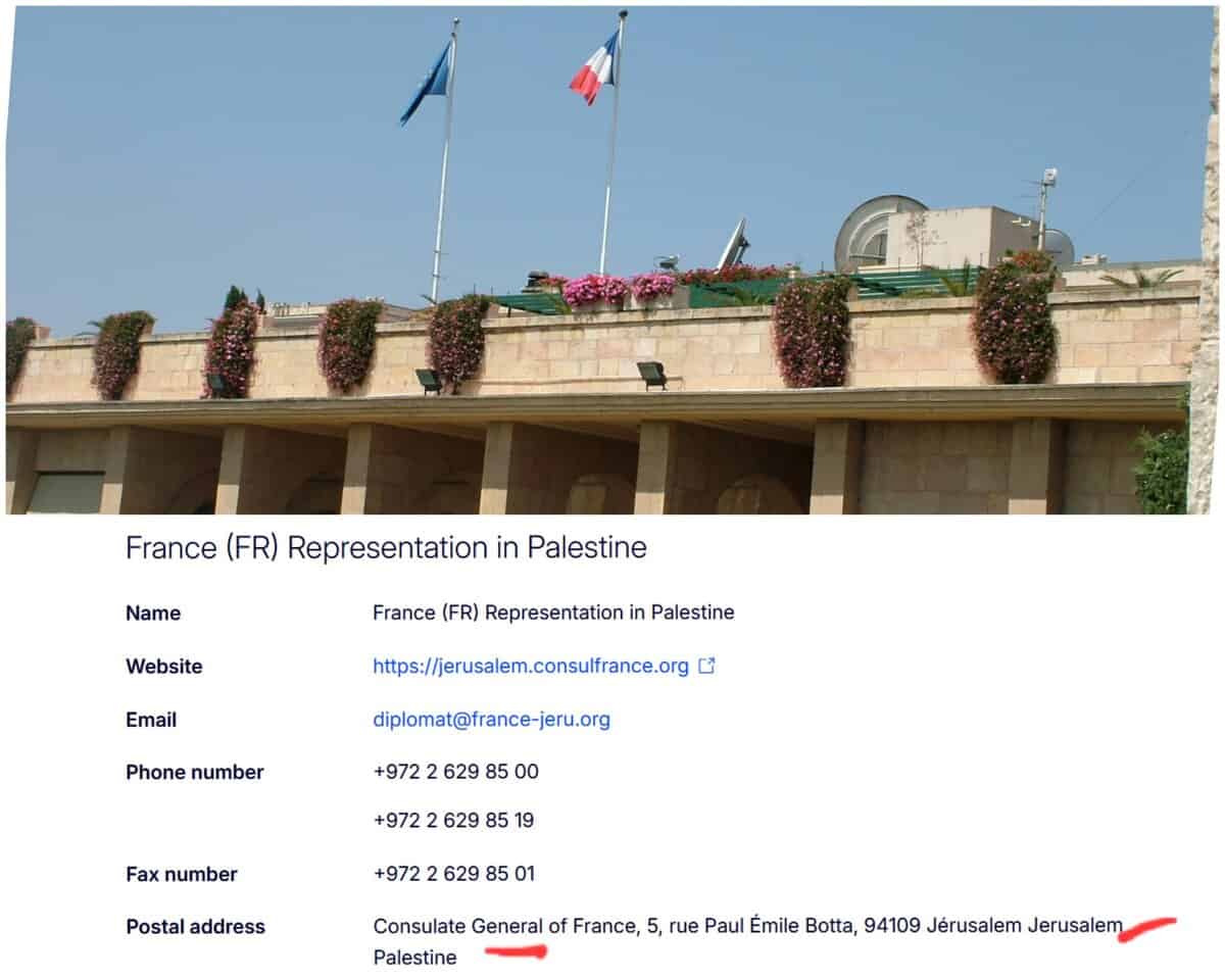Seperti disebutkan, Prancis melangkah lebih jauh dan memutuskan bahwa mulai sekarang konsulatnya di Yerusalem, di Jalan Paul-Émile Botta, tidak hanya akan didefinisikan sebagai “Perwakilan Prancis di Palestina”, tetapi juga seluruh jalan itu, menurut pandangannya, berada di “Negara Palestina”.