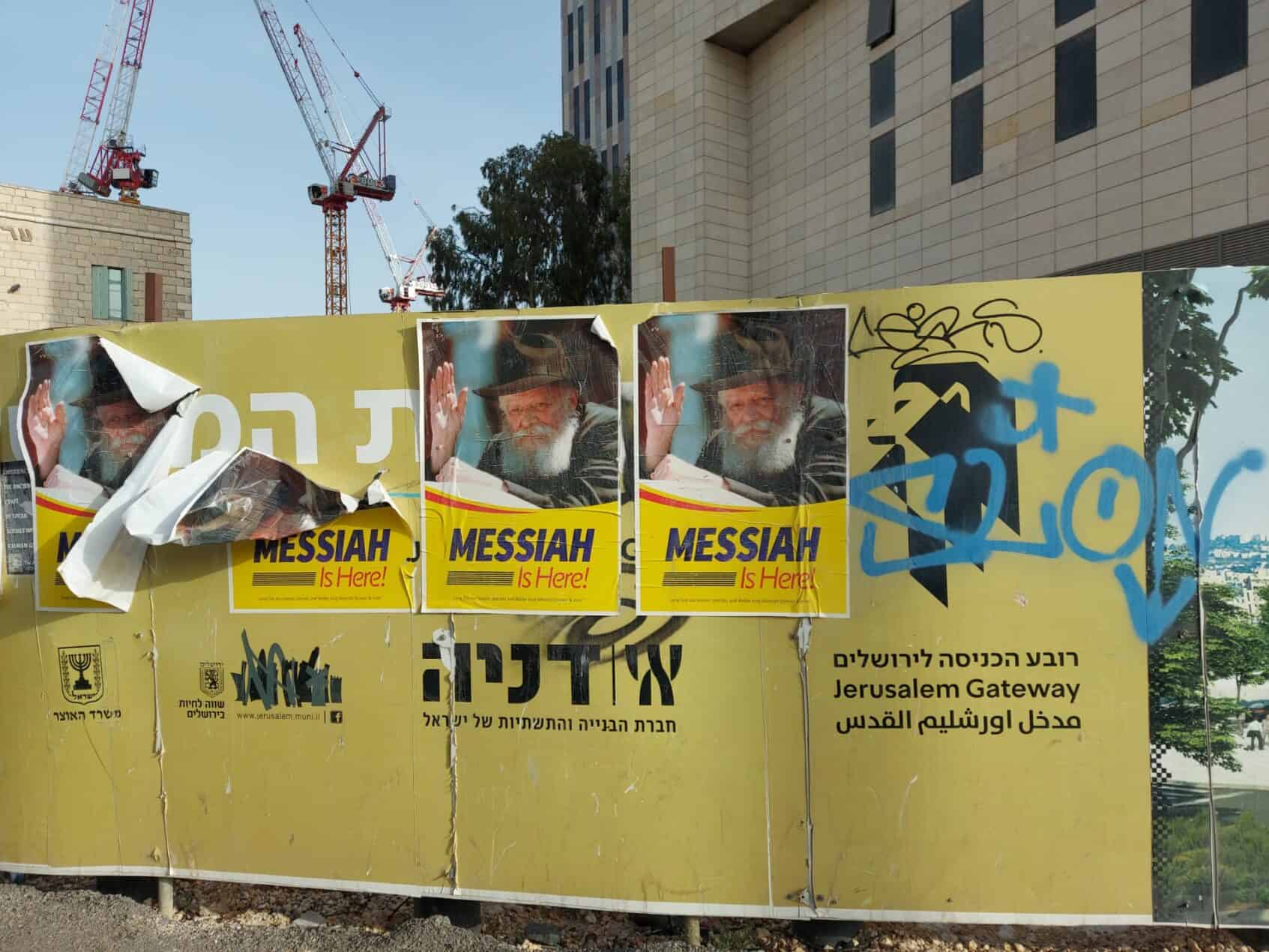 A concrete wall near the western entrance to Jerusalem bears a message that says more than any government report ever could. Amid cranes and construction dust, a large sticker shows the face of the Lubavitcher Rebbe with the words “Messiah Is Here.” Torn, faded, surrounded by graffiti – but still clearly visible. No campaign, no headline. Just presence