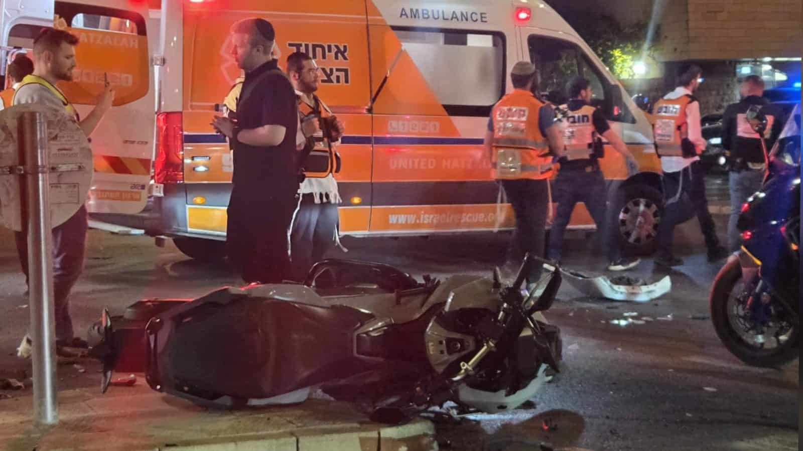 Katika Mtaa wa Zalman Shneor huko Baitulmaqdis, kwenye sehemu ya barabara yenye mteremko na kona fupi inayopunguza uwanja wa kuona, pikipiki iligongana na gari binafsi usiku. Wanaume wawili, takribani wenye umri wa miaka 25 na 50, walijeruhiwa vibaya na kiasi, na walihamishiwa Hospitali ya Shaare Zedek baada ya kupata huduma ya kwanza kutoka kwa wahudumu wa United Hatzalah na “Tzevet Hatzalah.”